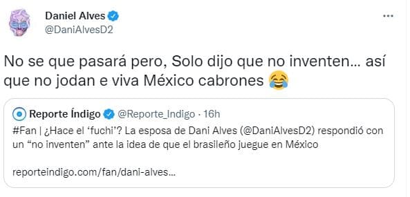 "Brindando Dani Alves por su decisión de venir a Pumas. Felicidades nos va a ir de maravilla", escribió un aficionado en Instagram, publicación a la que la pareja del brasileño respondió: "no inventen", acompañada con un emoji de risas con lágrimas.