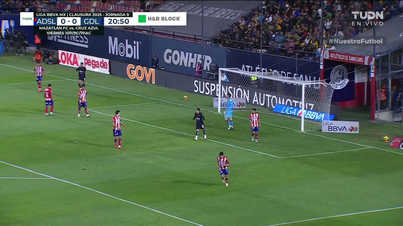 Pulido mete gran servicio al área, donde Luis Romo impacta de cabeza ante la estirada del guardameta de San Luis.