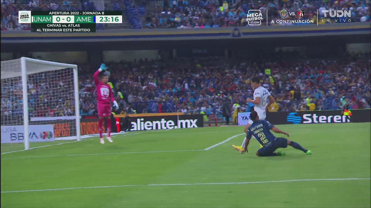 América arma la jugada y le queda al lateral, pero no puede definir de buena manera.