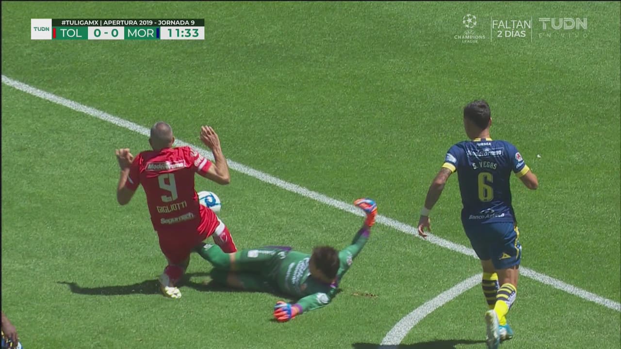 El arquero de Morelia le sacó una pelota al delantero de Toluca al borde del área, salvando la portería de los Diablos.