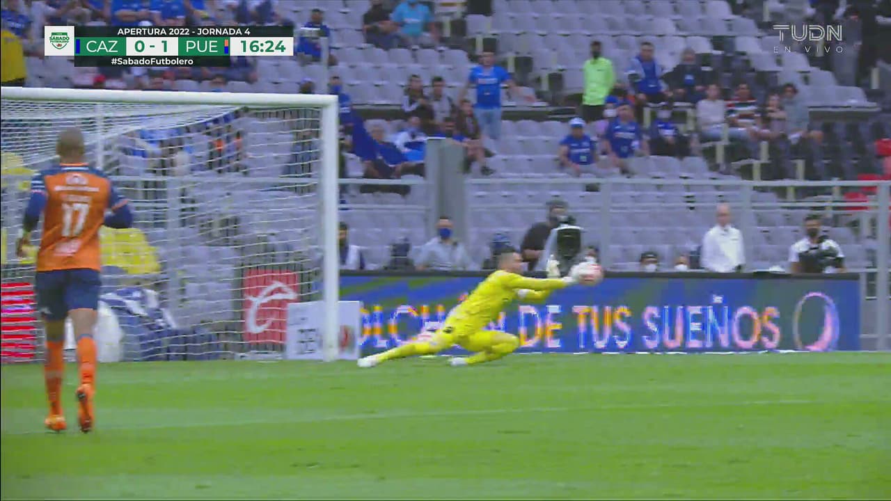 Rodríguez se anima con tiro de media distancia y el portero de Puebla resuelve bien al 16’.