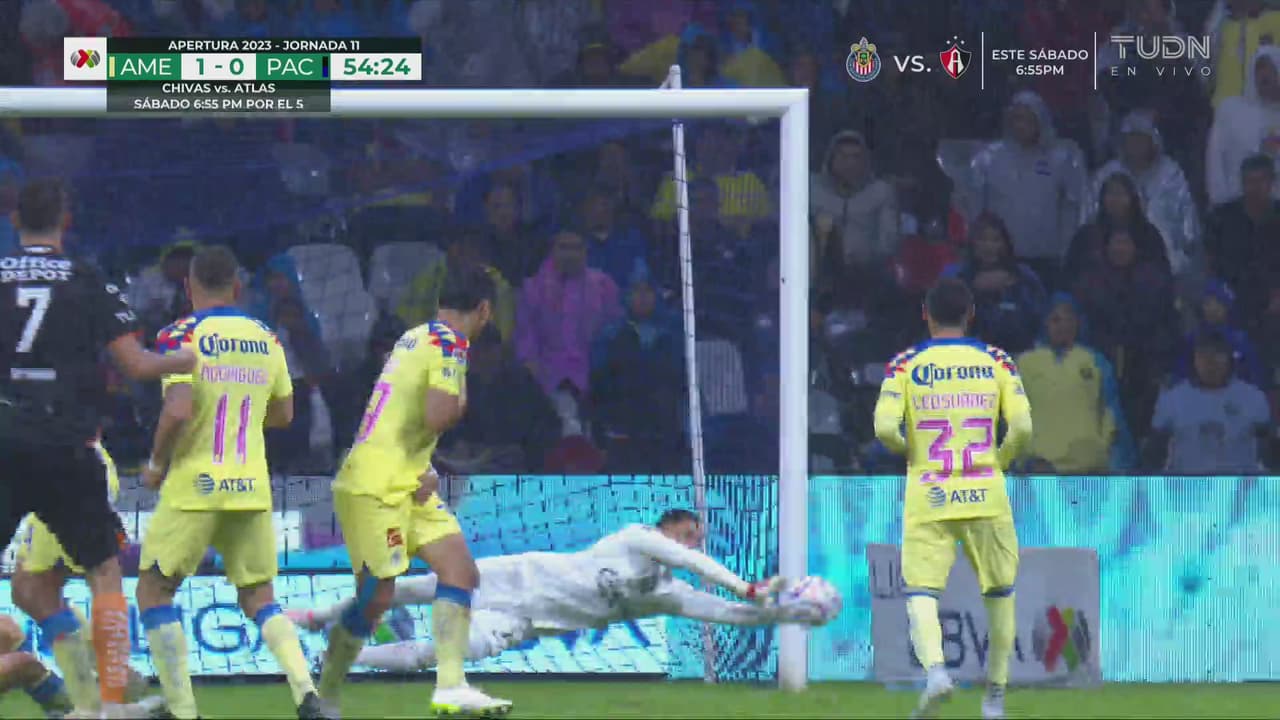 En tiro libre directo el jugador del Pachuca cobra cerca del poste y el portero del América se estira para rechazar el esférico.