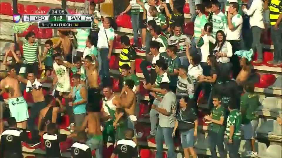 Otra vez, Julio. El delantero de Santos apareció sin marca en el área para exhibir a la defensa de Gallos y poner el 2-1 para los laguneros.