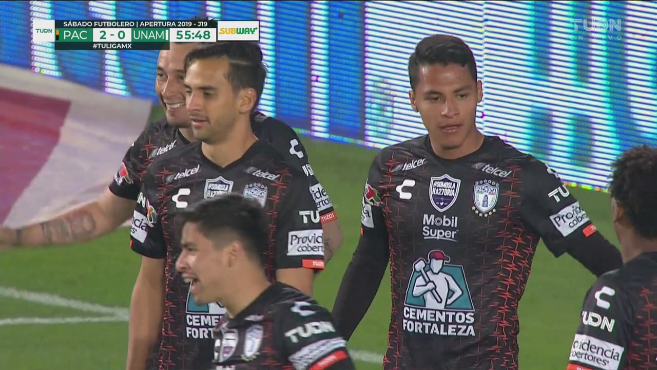 Balón a profundidad de Víctor Guzmán para Rubens, quien le puso un bombón al ‘209’ de los Tuzos, quien sólo tuvo que empujar al 55’.