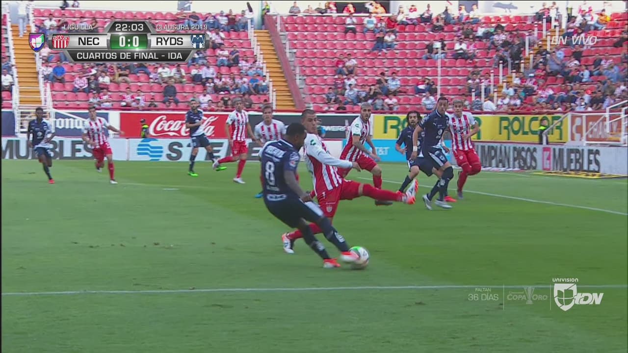 El delantero de Rayados, Dorlan Pabón, le pegó cruzado y no hubo reacción de Hugo González en el arco de Necaxa que miró como el balón se perdía ajustado al poste.