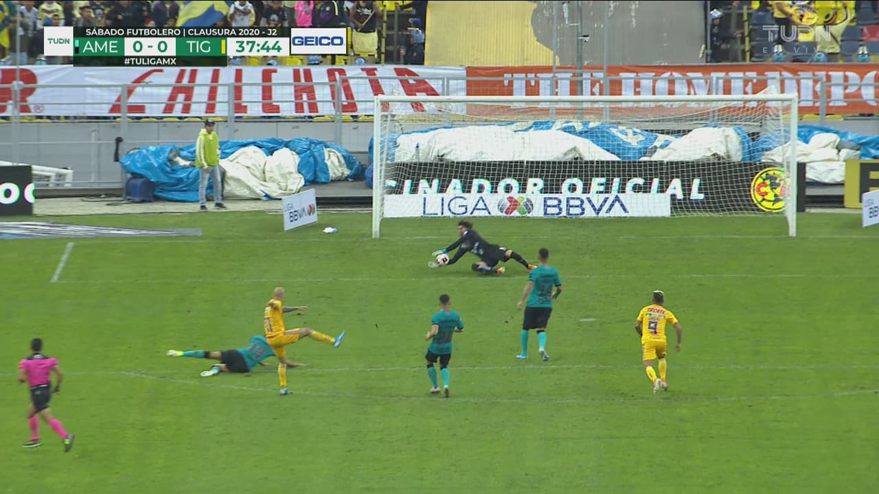 Disparo del refuerzo felino que el portero del América ataja abajo, pegado al palo, al 37’.