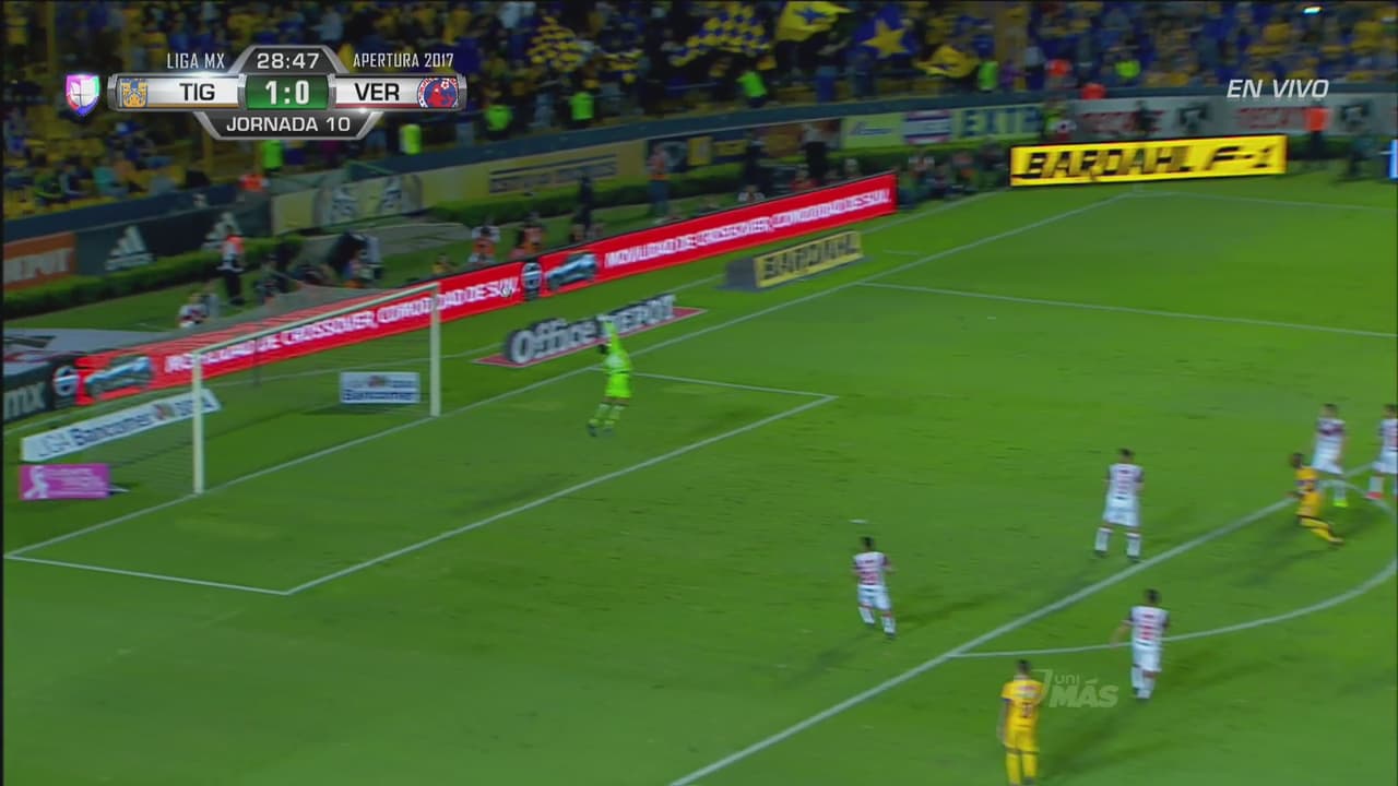 El arquero de Veracruz reacciona de estupenda forma para quitarle el gol al mediocampista felino.