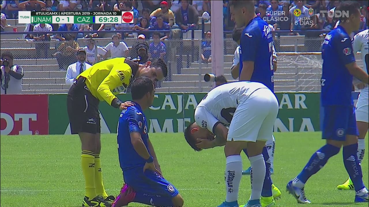 El volante de contención de Cruz Azul se golpeó con el delantero de Pumas en un salto disputando la pelota.