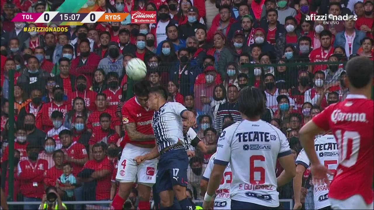 Valber y Jesús no se ven, disputan por aire, el jugador de Monterrey se lleva la peor parte.