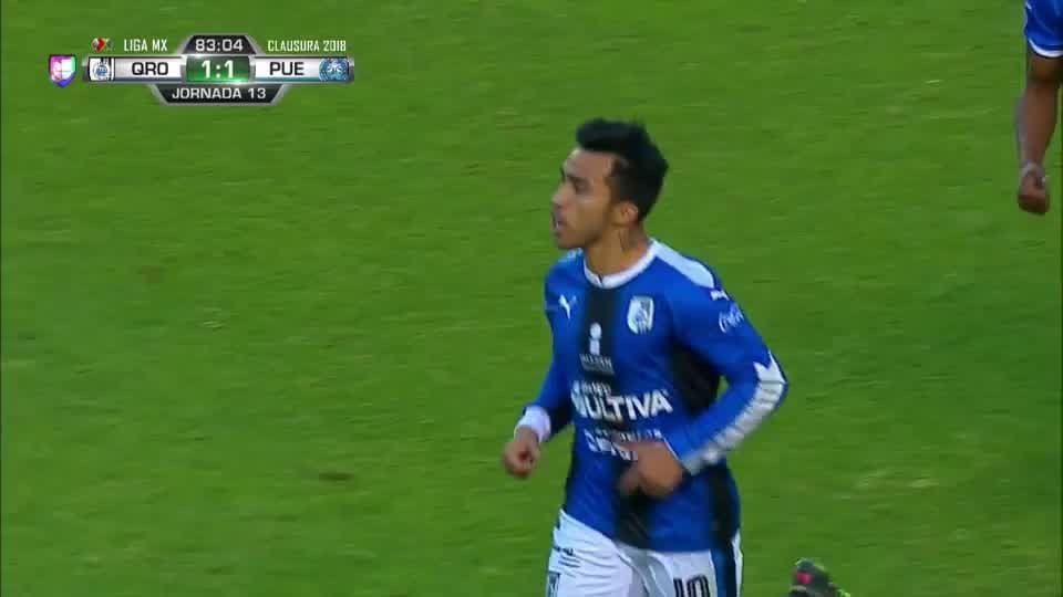 Camilo Sanvezzo remató de cabeza y la pelota se dirigió hacia el chileno quien sin pensarlo se tiró para conectar el balón con una vistosa tijera y marcar el segundo gol de Querétaro.
