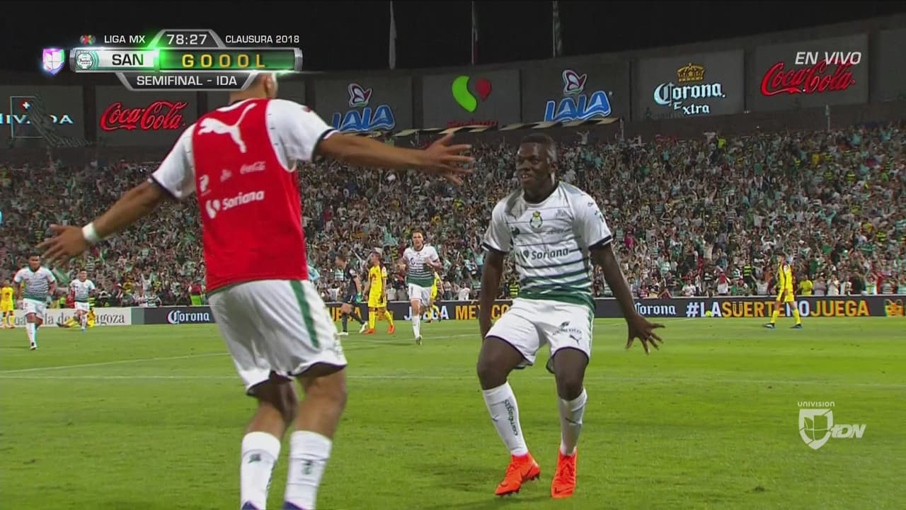 Una avenida en la zaga de América le permite al atacante de Santos vencer a Marchesín.
