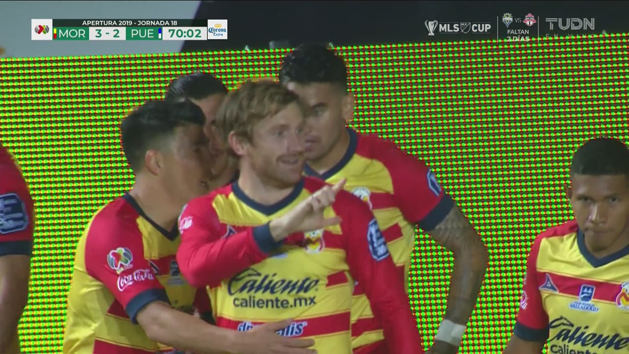 Otra vez Luis Mendoza manda un bombón al área de Puebla y el delantero venezolano define de pierna derecha para darle la ventaja a Morelia 3-2.