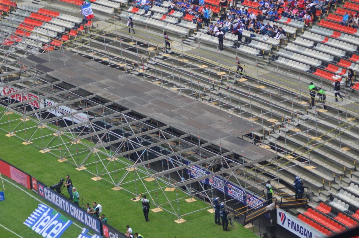 Durante el encuentro entre Cruz Azul y Monterrey, se pudo observar como la grada sur del Coloso de Santa Ursula está siendo convertida en escenario.