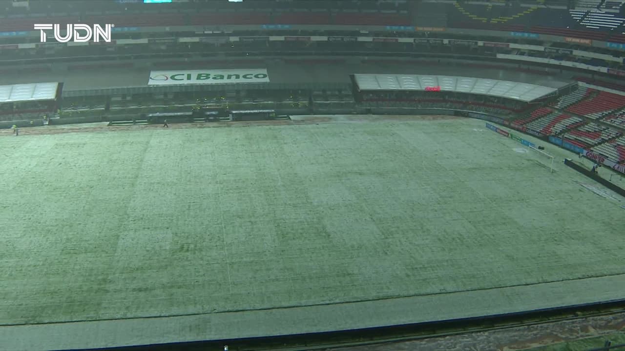 La intensa lluvia que cayó sobre el Coloso de Santa Úrsula provocó que la cancha se cubriera de granizo en una espectacular imagen.