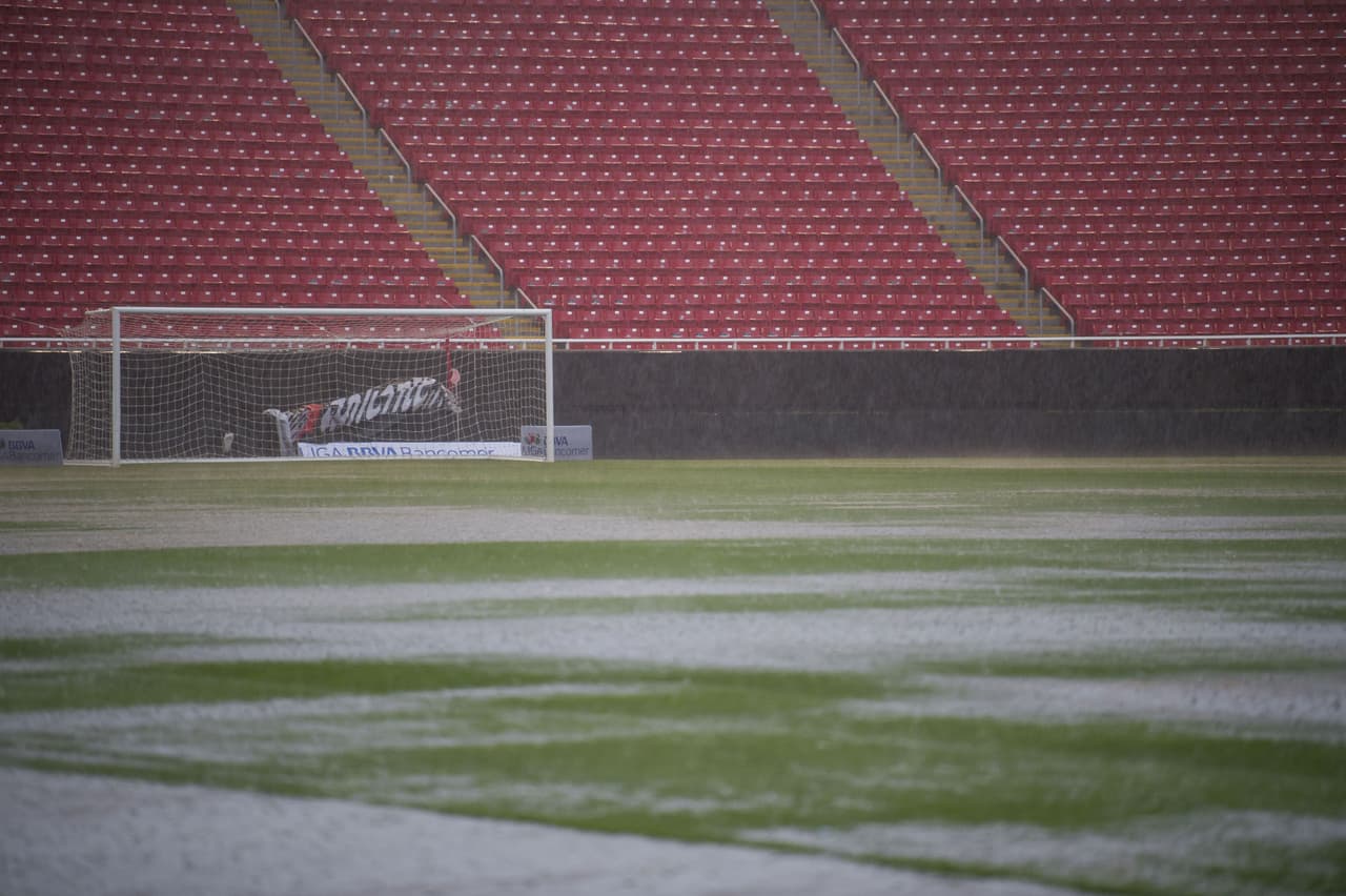 La cancha del estadio del Guadalajara quedó inundad por la intensa tormenta que se presentó en la ciudad.