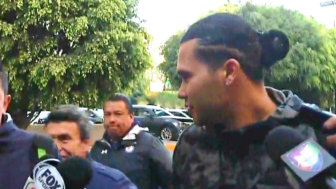 El nuevo delantero de Cruz Azul fue asediado por los medios de comunicación y, como si estuviera en la cancha encarando a los rivales, evitó con un rápido movimiento los micrófonos. Aquí el instante.