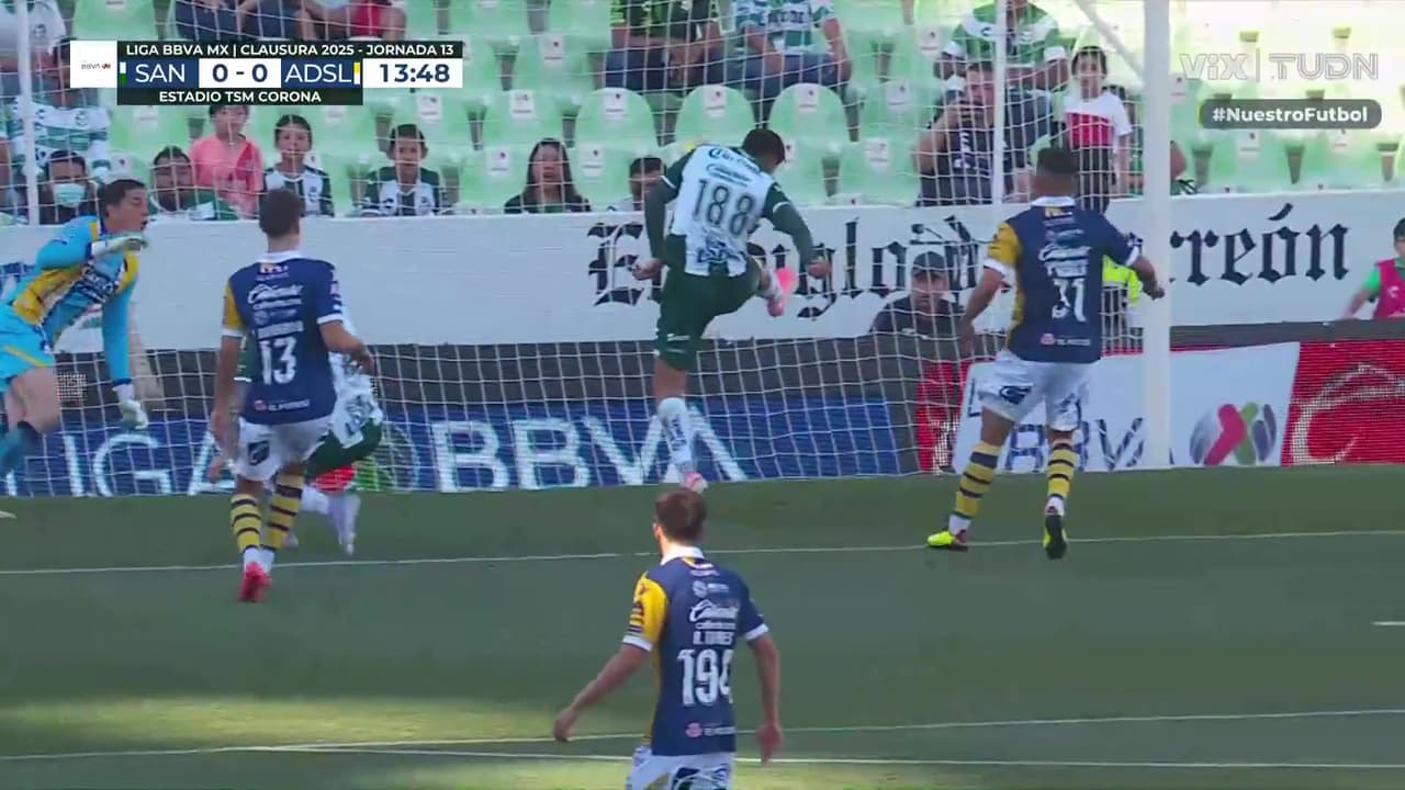 Iba a ser un golazo pero el central de Santos no logra rematar de buena manera y su tiro se va por encima de la portería.