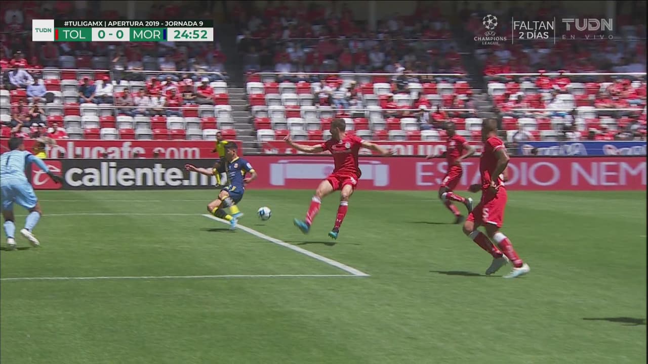 El volante de Monarcas recibió un centre de costado de Aristeguieta al que no pudo llegar, a pesar de la barrida.