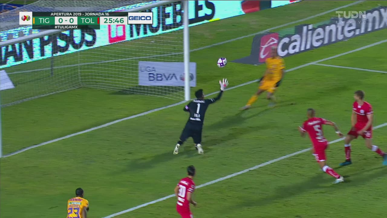El defensor de Tigres agarró de primera intención un centre que fue desviado en un jugador escarlata y alcanzó a atajar Talavera.