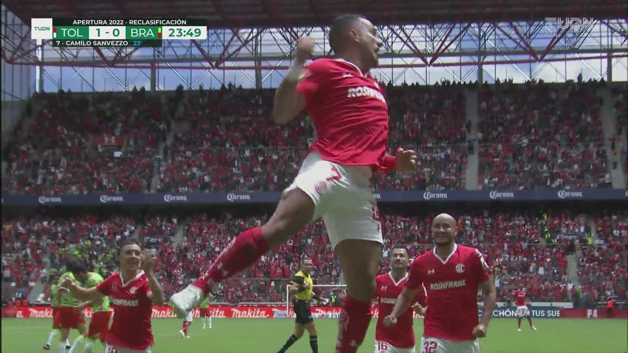 Tanto se salvó el Toluca que llegó su oportunidad de redimirse con la ofensiva. Camilo Sanvezzo llegó por izquierda, cortó al centro y con disparo a segundo palo marcó el primero.