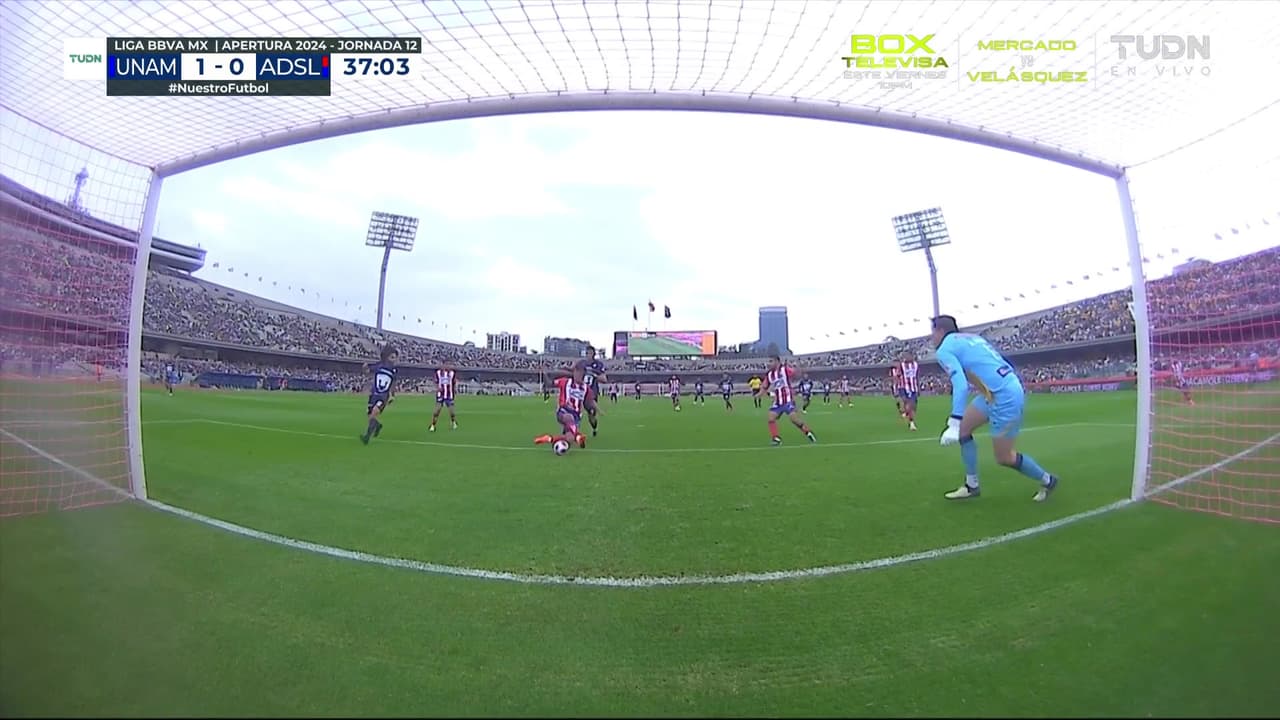 La jugada había terminado en un autogol de San Luis pero la intervención del video arbitraje decide marcar una mano previa del Chino Huerta.