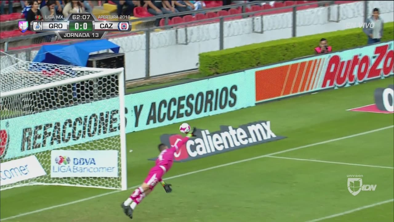 El mediocampista de Cruz Azul recortó hacia el centro, tras desbordar por la banda, se acomodó y sacó un tremendo disparo con la diestra que pegó en el poste lejano del arco queretano.