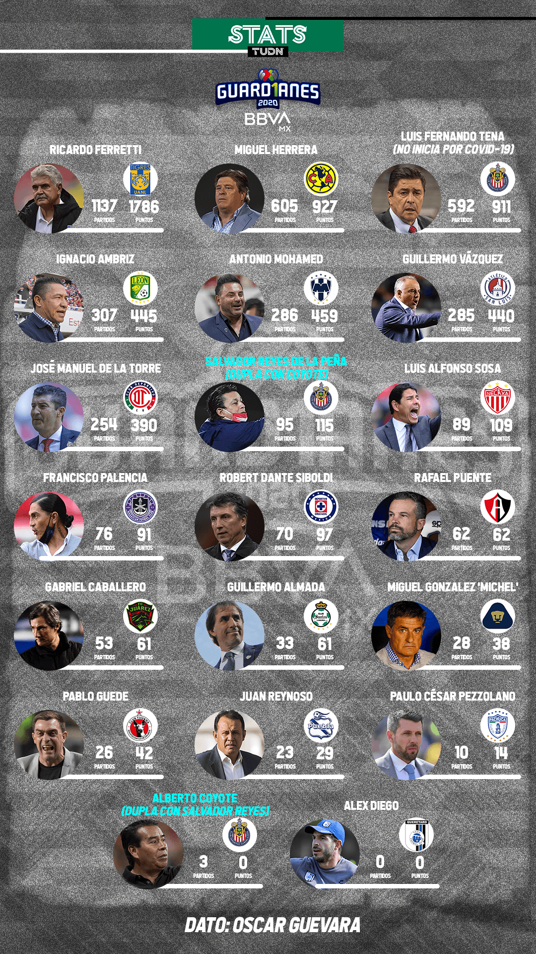 Ricardo Ferretti, Miguel Herrera y Luis Fernando Tena llegarán al Guard1anes 2020 Liga BBVA MX como los entrenadores de mayor experiencia en el futbol mexicano, tanto en partidos como por puntos.