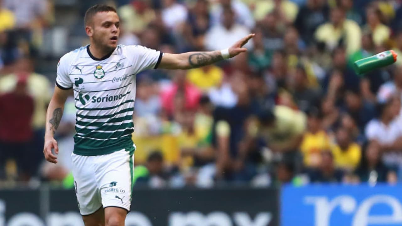 Santos no quiere dejar con vida a su rival. Un disparo de tiro libre de Brian Lozano fue desviado por Cecilio Domínguez, dejó vencido a Marchesín y pegó en el poste.