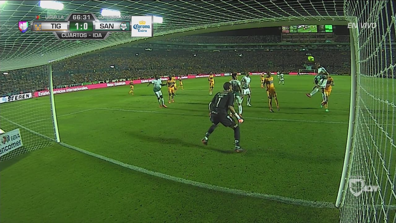 Min 22 TIG 1-0 SAN Goooooooooooool de @TigresOficial, anotado por @hugoac_4 que remata de cabeza y la pone al poste contrario del portero. pic.twitter.com/YN4OG2LfKS