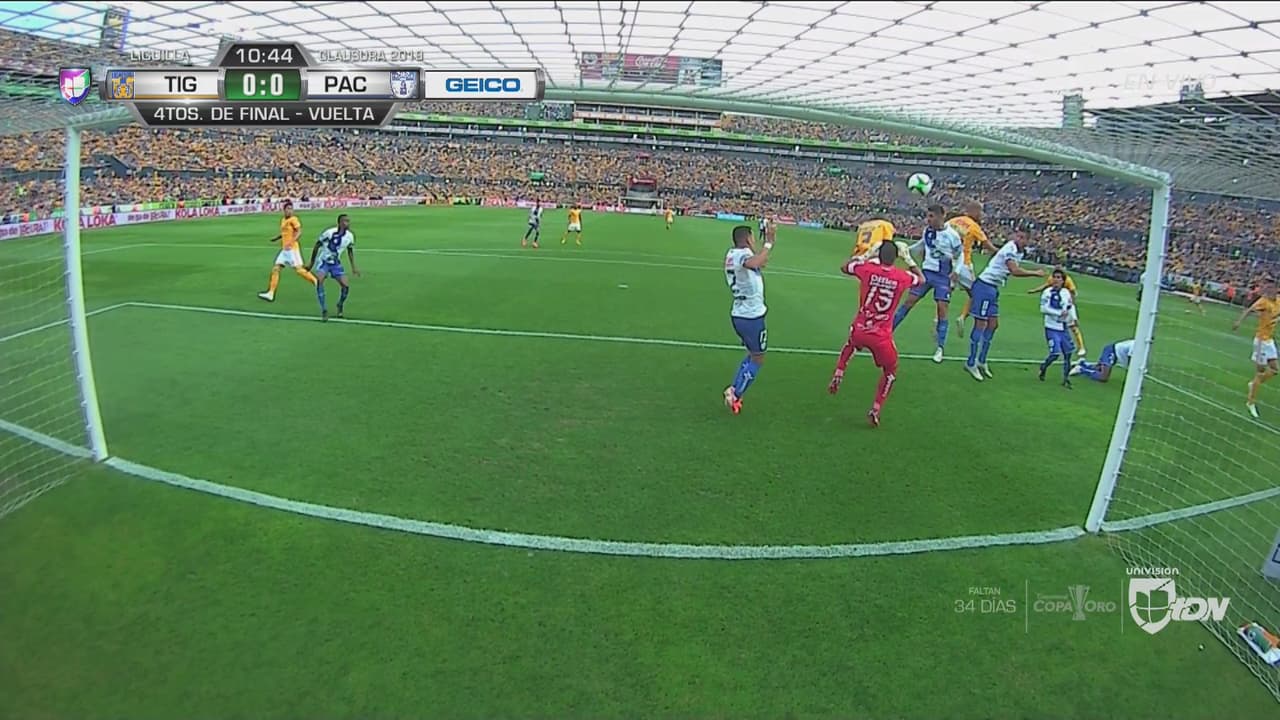 El delantero ecuatoriano se levantó en el área, le ganó a la defensa de Pachuca, pero su remate se fue desviado de la portería visitante.