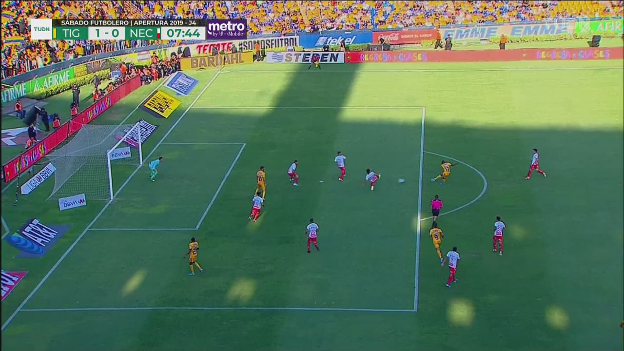 El jugador de Tigres disparó cómodamente desde fuera del área, pero su disparo salió desviado.
