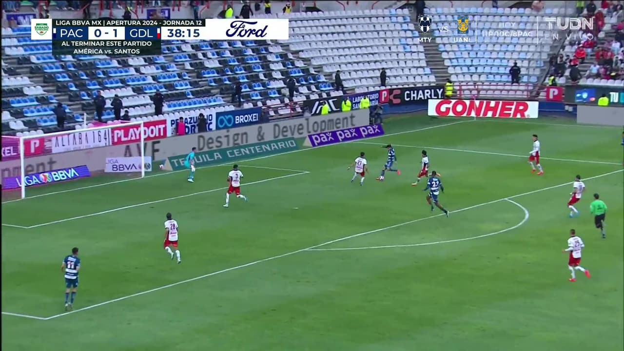 Pachuca logra generar una buena jugada ofensiva pero es detenida por el defesa central de las Chivas.