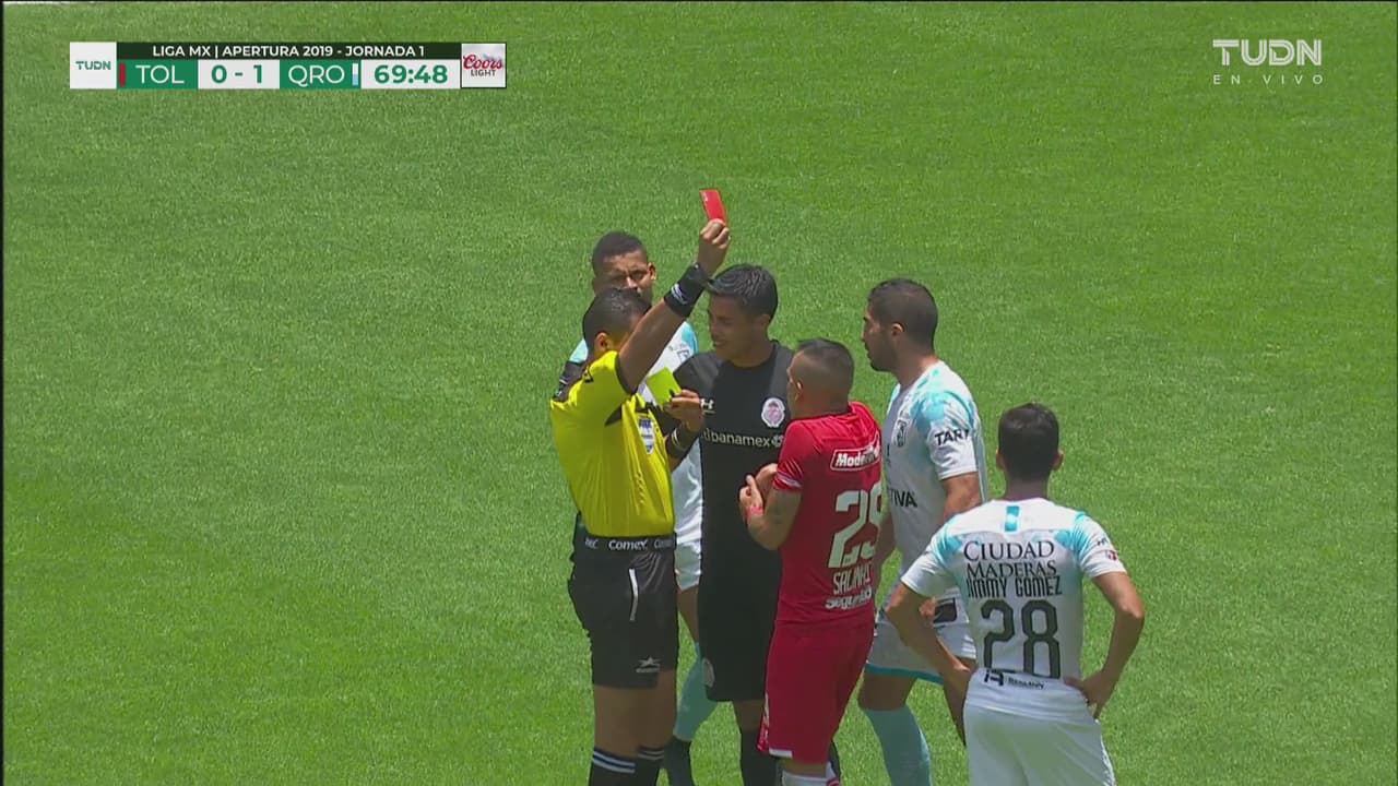 El árbitro primero había amonestado al defensa del Toluca, pero la revisó en el videoarbitraje y decretó la expulsión al 70’.