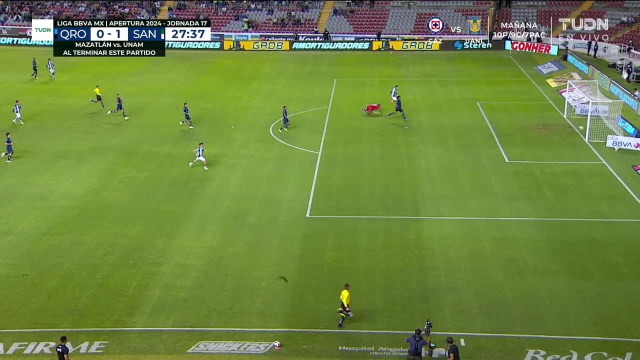 Los Gallos se salvan del 2-0 gracias a que el tiro de Santiago no logró ajustar bien su remate.