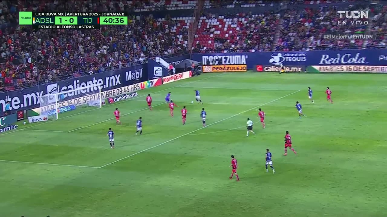 El delantero de Atlético de San Luis hizo una de más y no pudo definir directo al arco de Xolos.