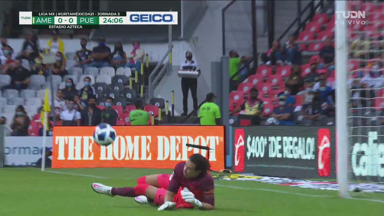 El atacante de Puebla trata con un zapatazo de fuera del área, pero el portero está atento, al minuto 24'.