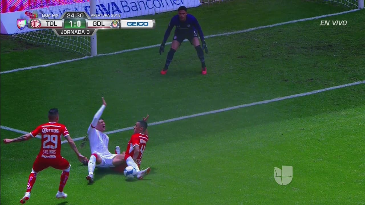 El delantero de Chivas intentó engañar al silbante exagerando un roce con un defensor de Toluca.