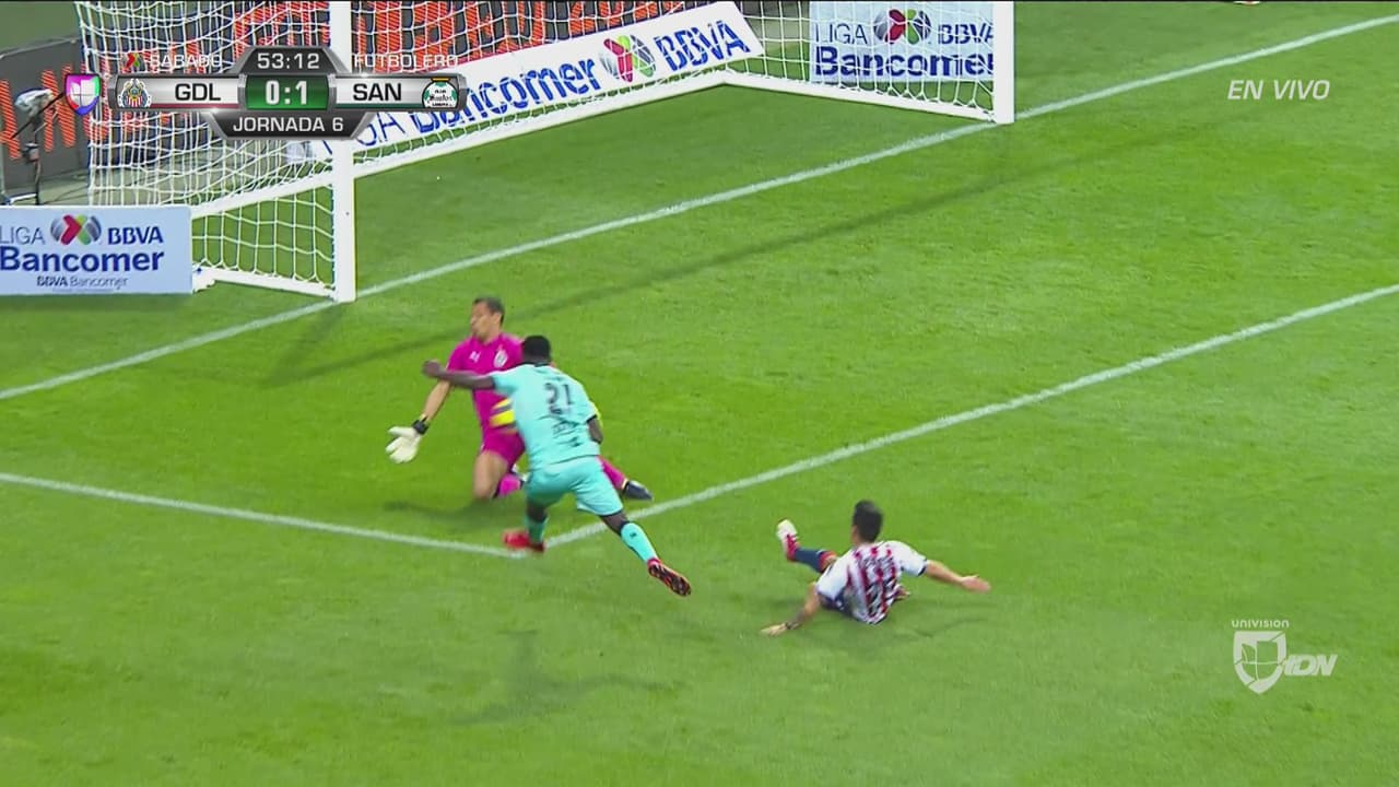 Djaniny se enfiló al área completamente solo, pero Rodolfo Cota apareció para atajar la pelota y robarle el segundo gol a Santos.