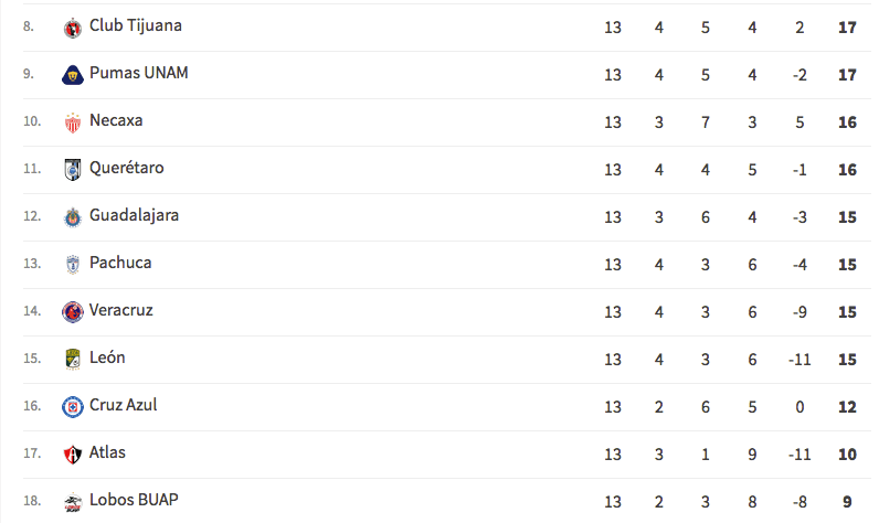Se ubica en el lugar 12 con 15 puntos y con una diferencia de -3 en las estadísticas de goleo. Solo dos puntos lo separan del último clasificado por ahora, que sería Tijuana en el lugar ocho de la general. No es mucha la diferencia para acceder a la pelea por un boleto.