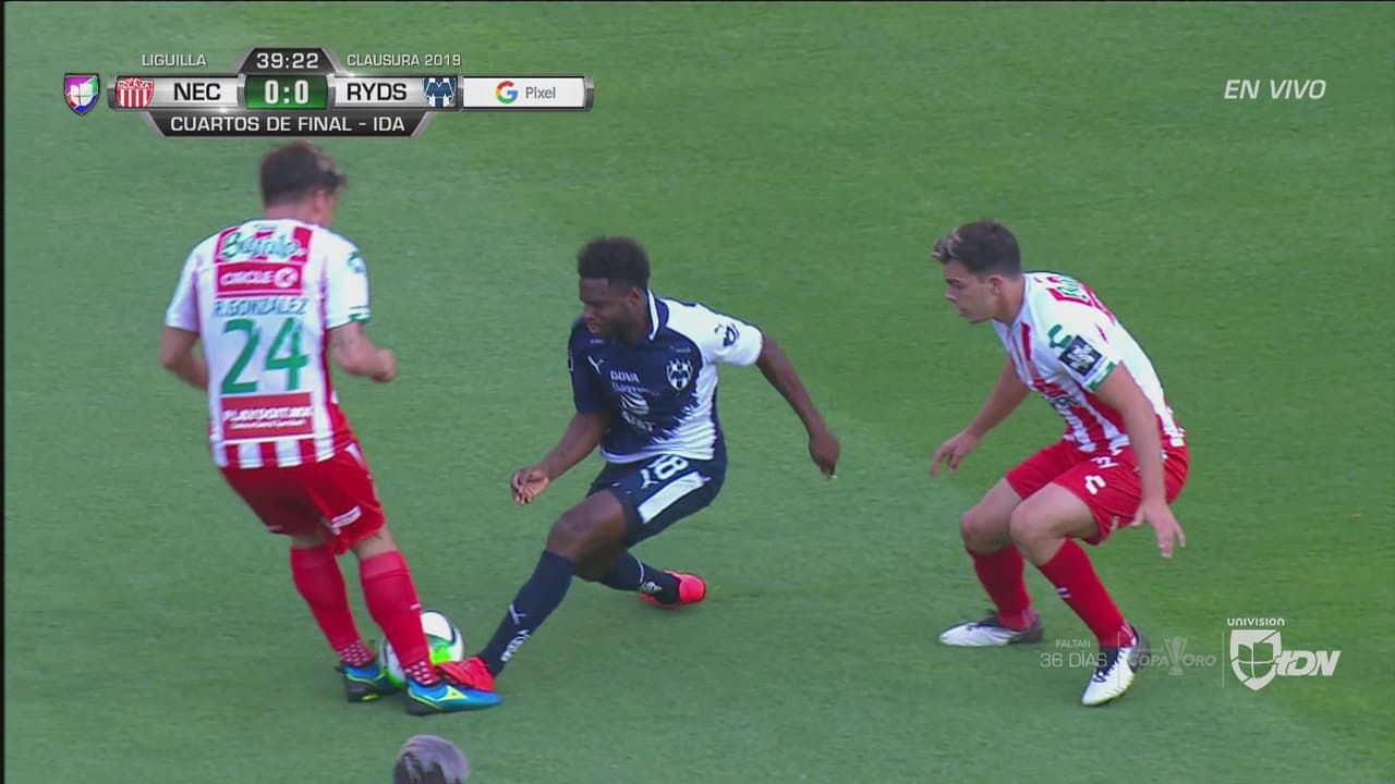 Avilés Hurtado recibe la segunda amarilla por una fuerte entrada a Álvarez y deja con diez hombres a Rayados ante los Rayos.