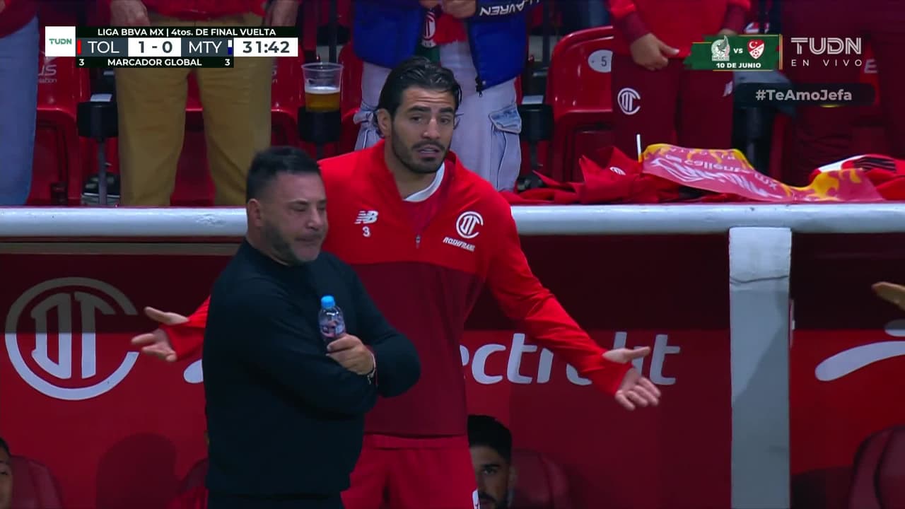 El jugador de los Diablos Rojos patea un balón a la banca de Rayados y se gana la tarjeta roja sin ver un minuto de juego.
