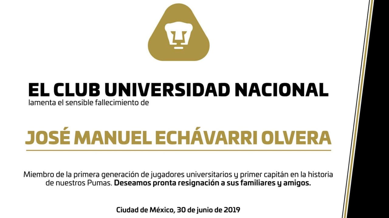 El club felino anunció la noticia por medio de sus redes sociales con un mensaje dirigido a la familia del ídolo, quien formó parte de la primera generación de jugadores de la UNAM.