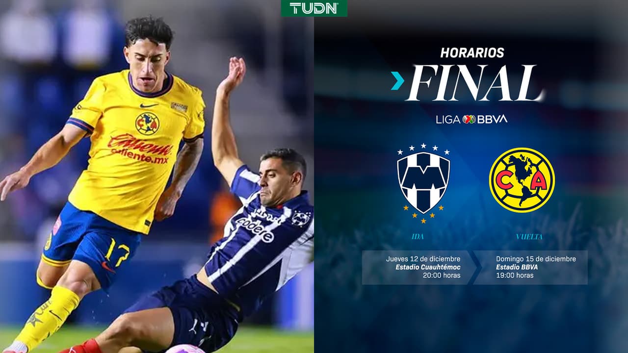 - Monterrey vs. América - Estadio BBVA | Domingo 15 de diciembre a las 7:00 pm tiempo del Centro de México (Canal 5 y TUDN), y a las 8:00 pm del Este, 7:00 pm del Centro y 5:00 pm del Pacífico en Estados Unidos (Univision y TUDN).