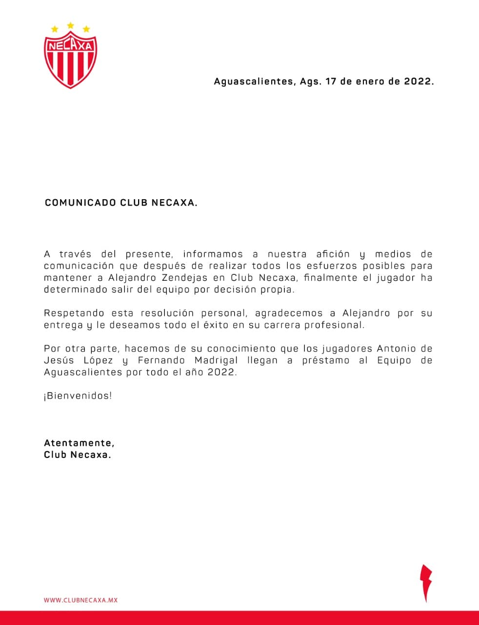 Necaxa anunció la llegada de los jugadores a través de un comunicado publicado en sus redes sociales en donde confirmó la salida de Alejandro Zendejas.