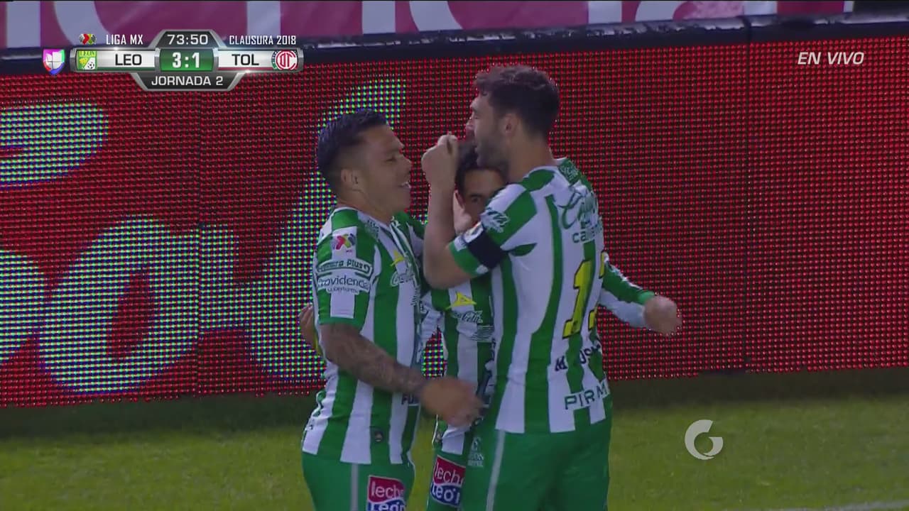 En un contragolpe fulminante, Navarro recibió la pelota dentro del área y le tocó por encima al portero de Toluca para hacer el tercer gol de León que se encamina a la victoria.