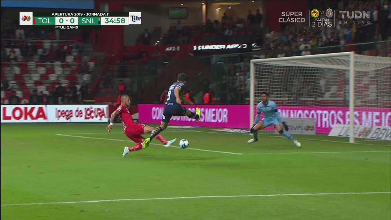 La defensa del Toluca se distrajo y el argentino quedó de cara a la puerta, pero tiró desviado al 34’.