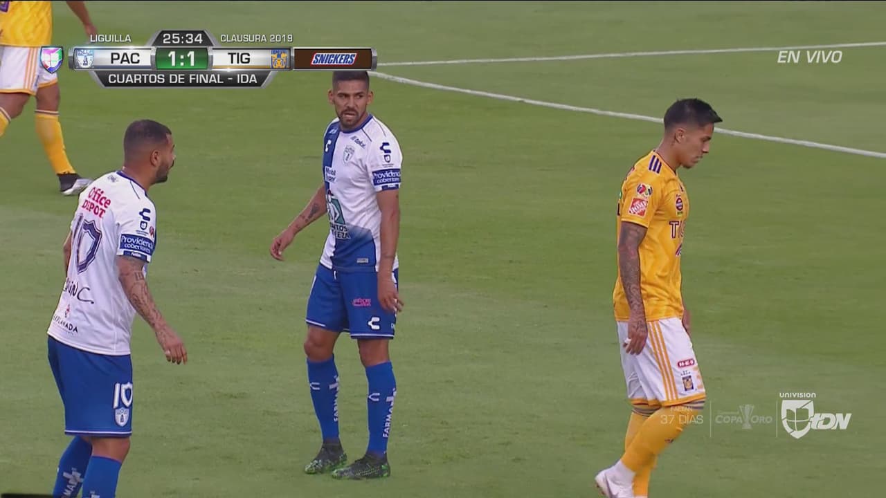 El delantero argentino del Pachuca presionó en la salida al defensa de Tigres que contestó con un ‘pechazo’ y tuvo que intervenir el árbitro Galvan para que no pasara a mayores.