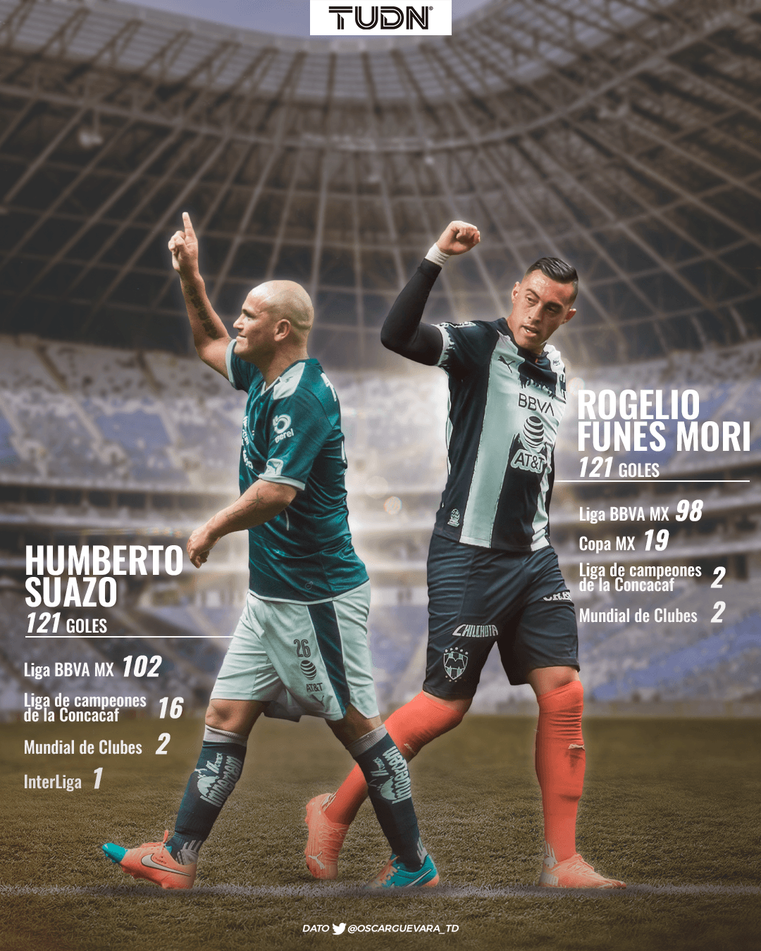Funes Mori lleva 98 goles en la Liga BBVA MX, Humberto Suazo hizo 102 en esta liga. Cabe mencionar que Chupete no marcó en Copa MX, pero sí lo hizo en el InterLiga de 2008, luego de que este torneo fuera decretado como oficial. Ambos elementos marcaron dos goles en el Mundial de Clubes.