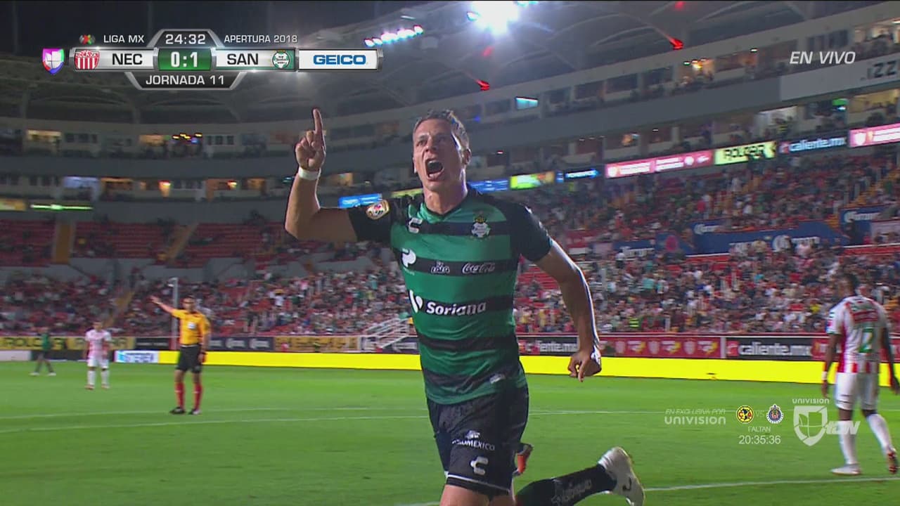 Necaxa regaló el balón en la salida y permitió que Santos centrara para encontrar al argentino sobre el poste más lejano de Hugo González.