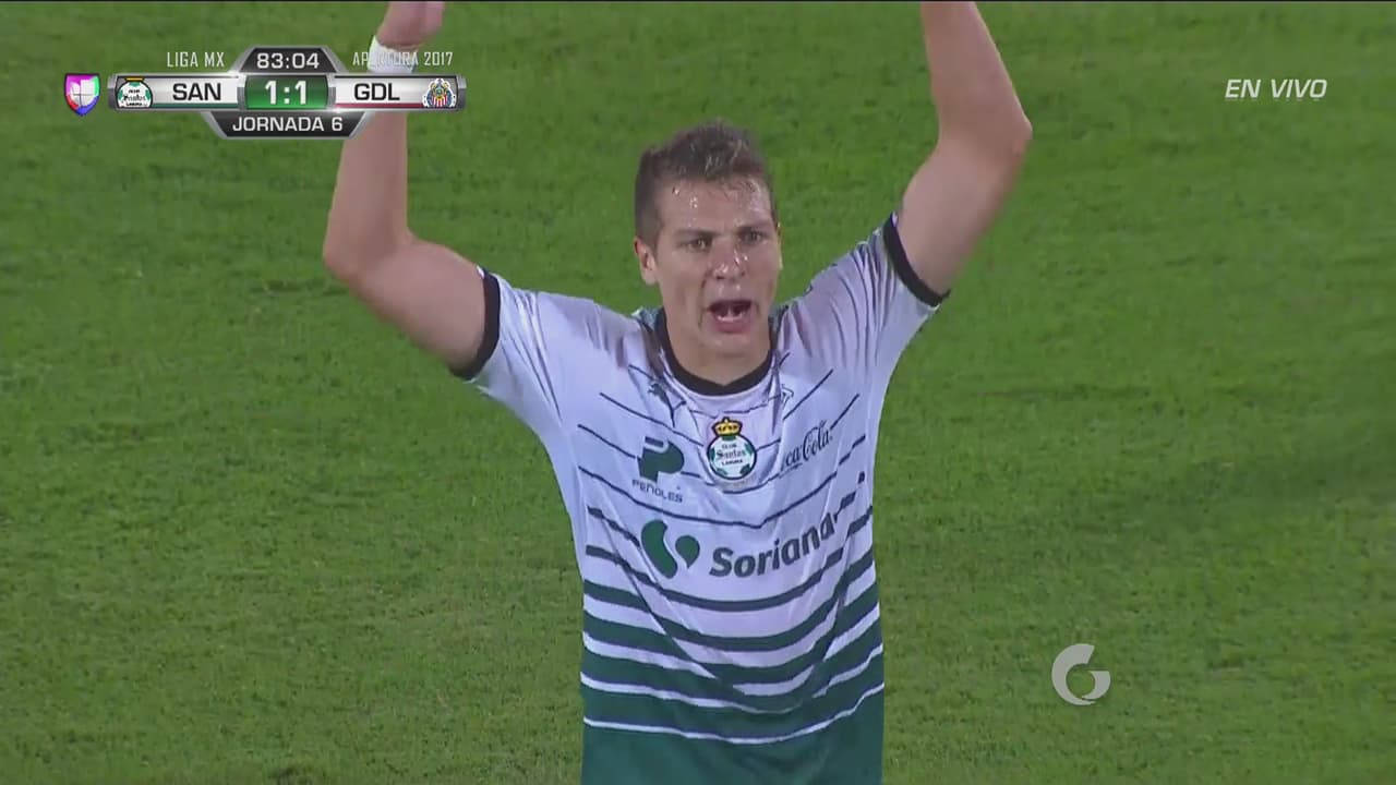 Tremendo remate del delantero de Santos para empatar ante Chivas ante la pobre marca de Carlos Salcido.